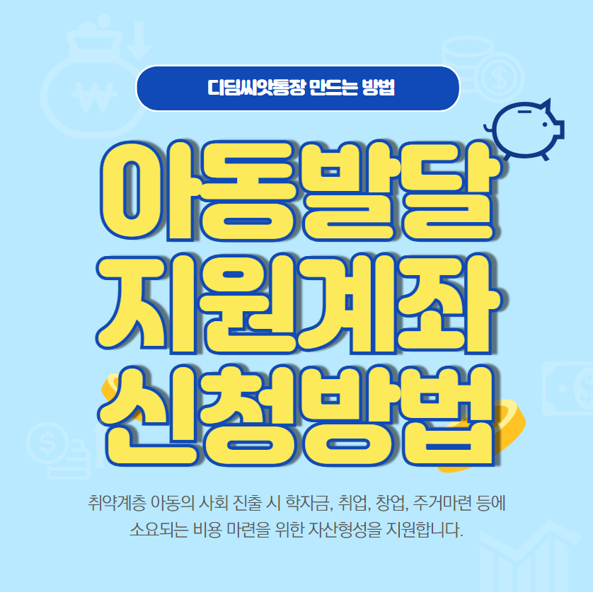 아동발달지원계좌 디딤씨앗 통장은 취약계층 아동의 사회 진출에 필요한 학자금이나 취업 및 창업, 주거비용 마련을 위한 초기 비용을 매월 현금으로 통장에 적립해 주는 자산형성 지원 정책입니다.