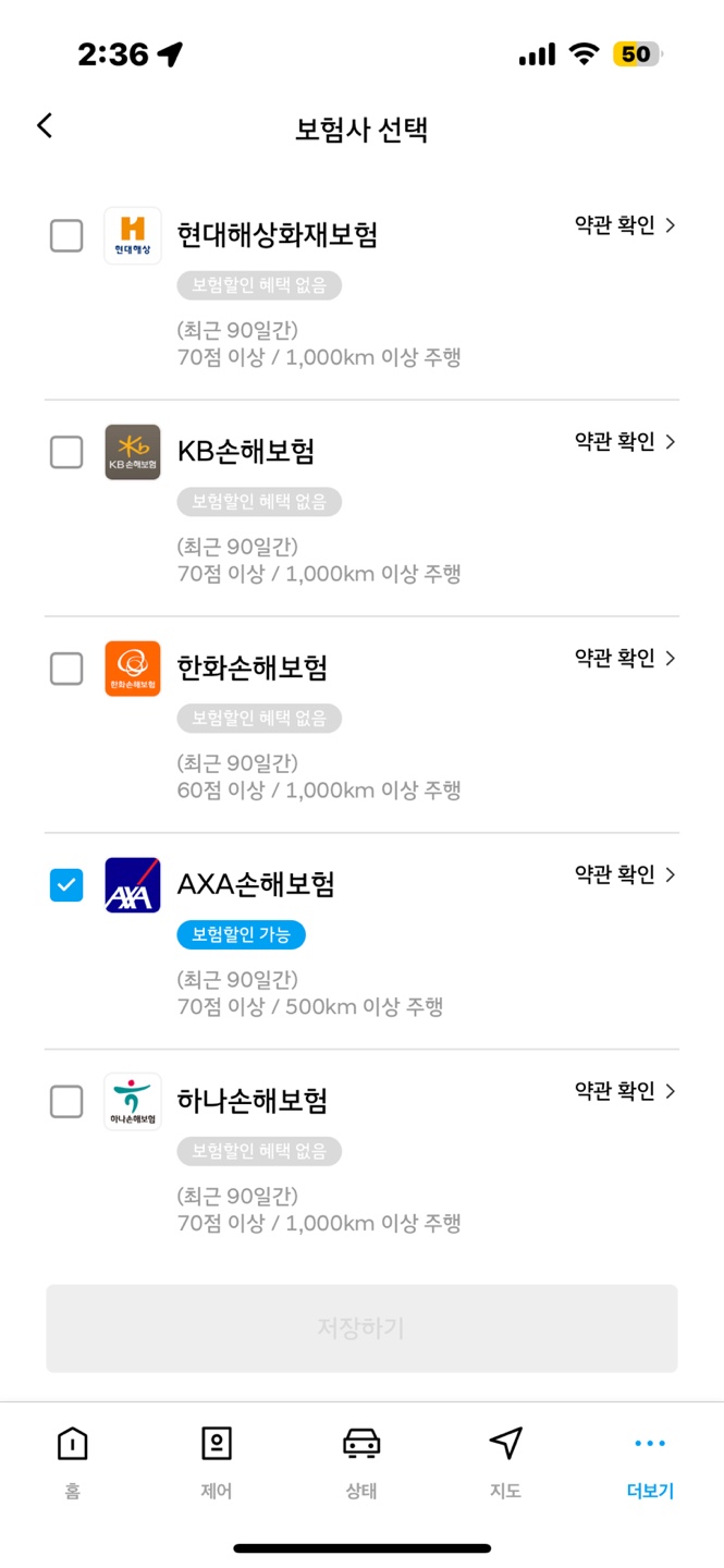 악사 AXA 보험사의 경우, 블루링크로 500km만 안전운전 습관 체크가 되면 할인 더 해준다고 해서 보험료를 산정해 봤는데, 결국 현대해상 보험료가 이리저리 해봤더니 오히려 싸서 그냥 현대해상에서 ECO 마일리지 할인 특약 환급되는 거 반영해서 갱신하기로 했다.