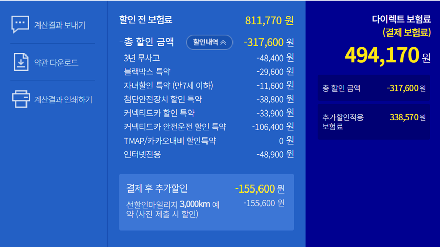 하여간, 그 공포스러운 추가지출 자동차보험을 재가입하려고 이리저리 견적을 받아봤는데, 아뿔싸 싶은 것이 있다. 나는 분명히 현대자동차 앱 중에 '블루링크'의 안전운전 습관만 켜 놓으면 커넥티드카 안전운전 할인을 받는 줄 알았는데, 그게 아닌 모양이었다.